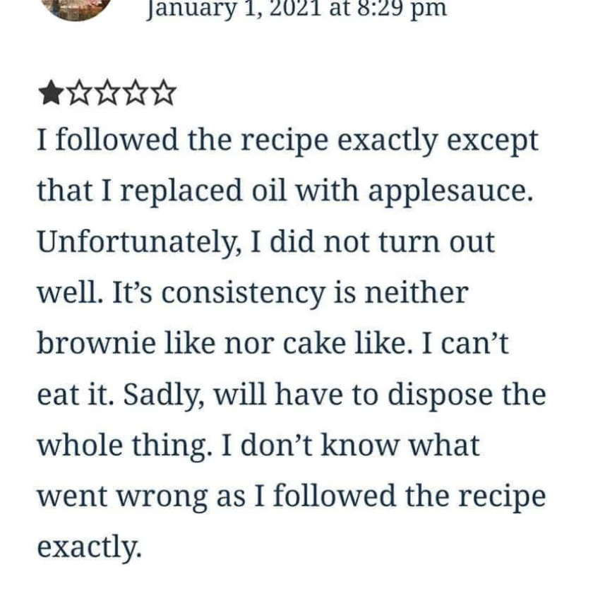 7. “I decided to use your recipe, but my mom’s instructions, and it didn’t work.”