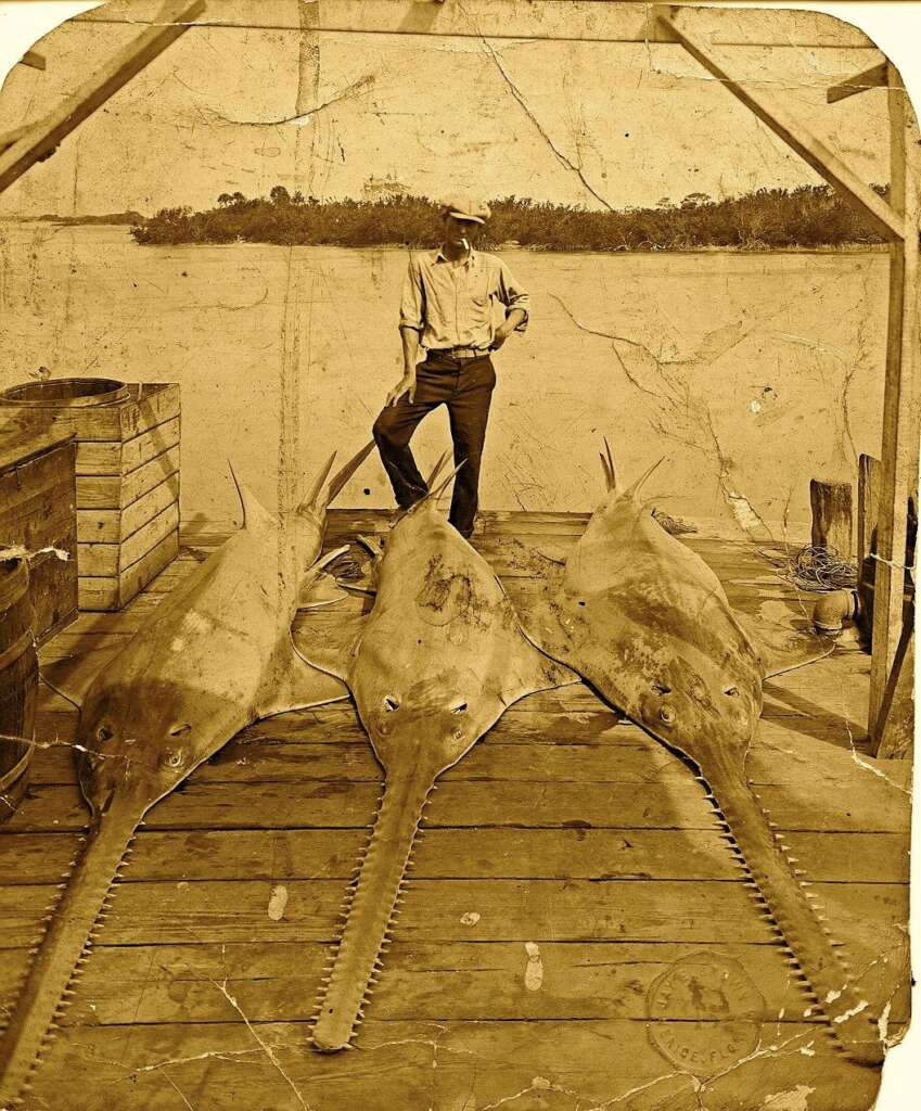 20. “My Grandpa posing with his freshly caught sawfish in the 1940s.”