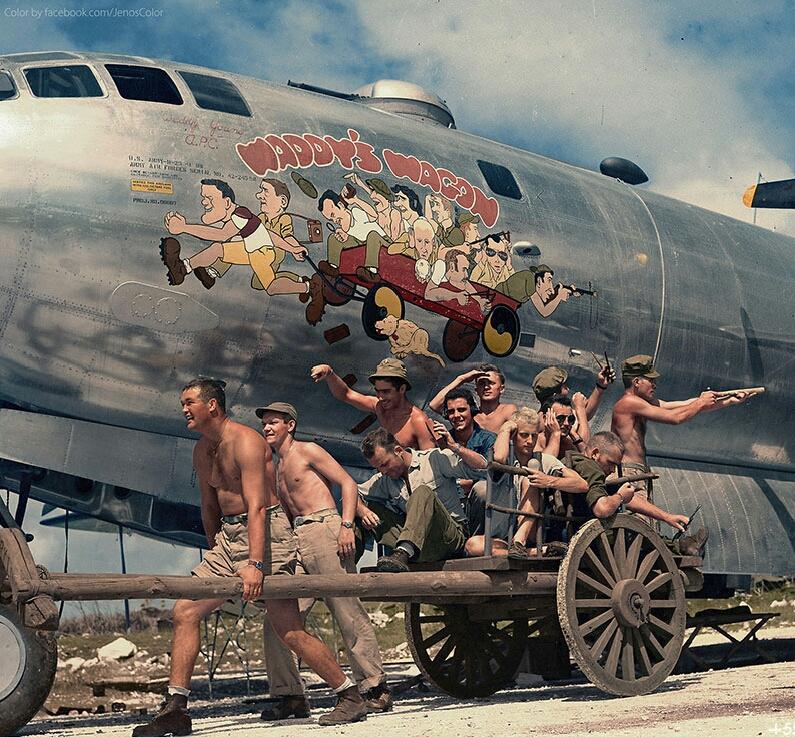26. “Captain ‘Waddy’ Young and crew pose in front of their caricatures on their B-29 Superfortress on 11/24/44.”