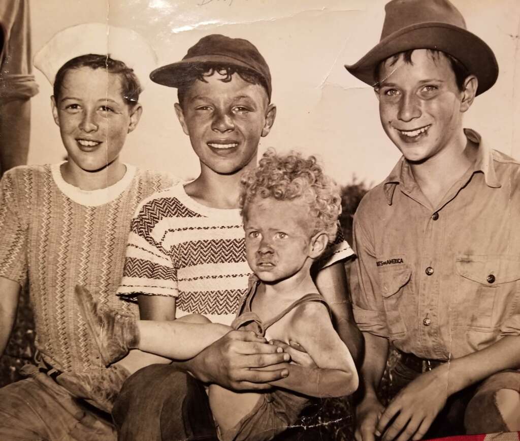 1. “Three boys, including my grandfather (right), find a missing child in a corn field after a town-wide, day-long search in 1942.”