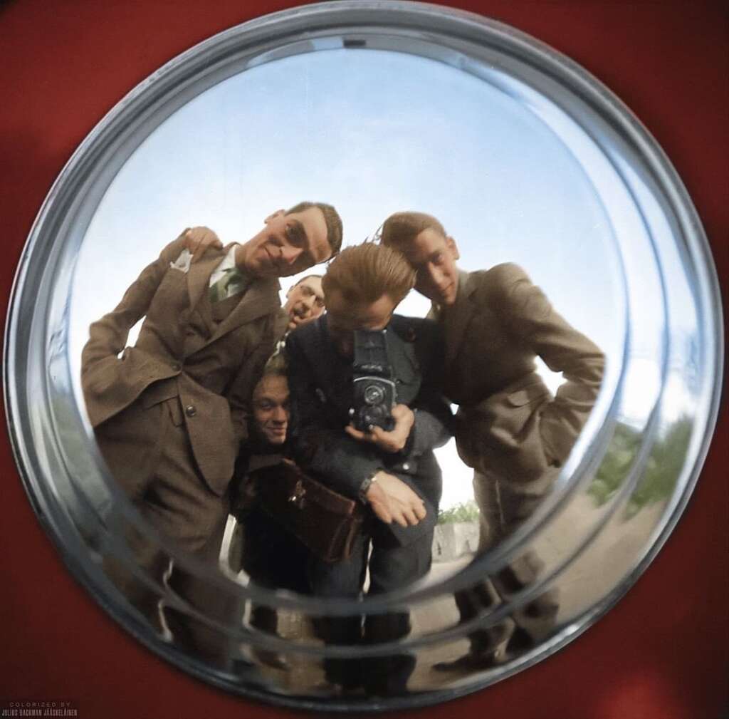 87. Five men pose for a ‘selfie’ using the reflection of a chrome hubcap. Taken in Paris in 1942.