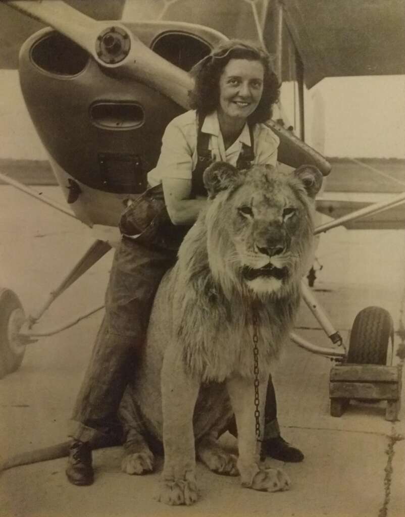 38. “My grandmother with Sultan, her favorite lion from her troop, in front of her plane that she flew just after WWII in 1947.”