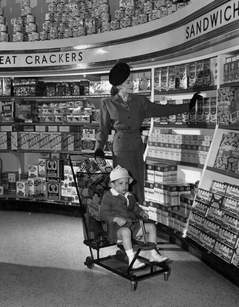 52. “This impeccably dressed woman shopping for groceries with her son in 1945.”