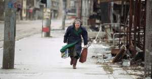 14. A mother and child run for their lives along Sniper Alley to avoid being hit by sniper fire in Sarajevo in 1995