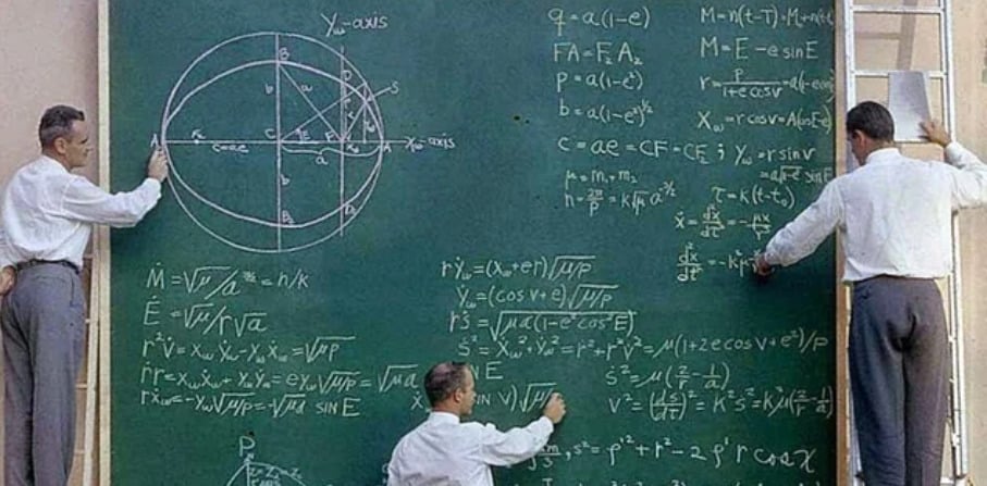 Charts, models, and chalkboards filled the room in this pre-digital era of planning missions to space with pure brainpower and whiteboards.