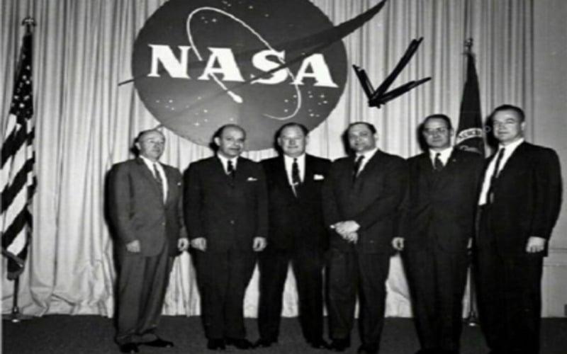 Visionaries and engineers stand together in this historic shot, pioneers of spaceflight and the foundation of what NASA would become.