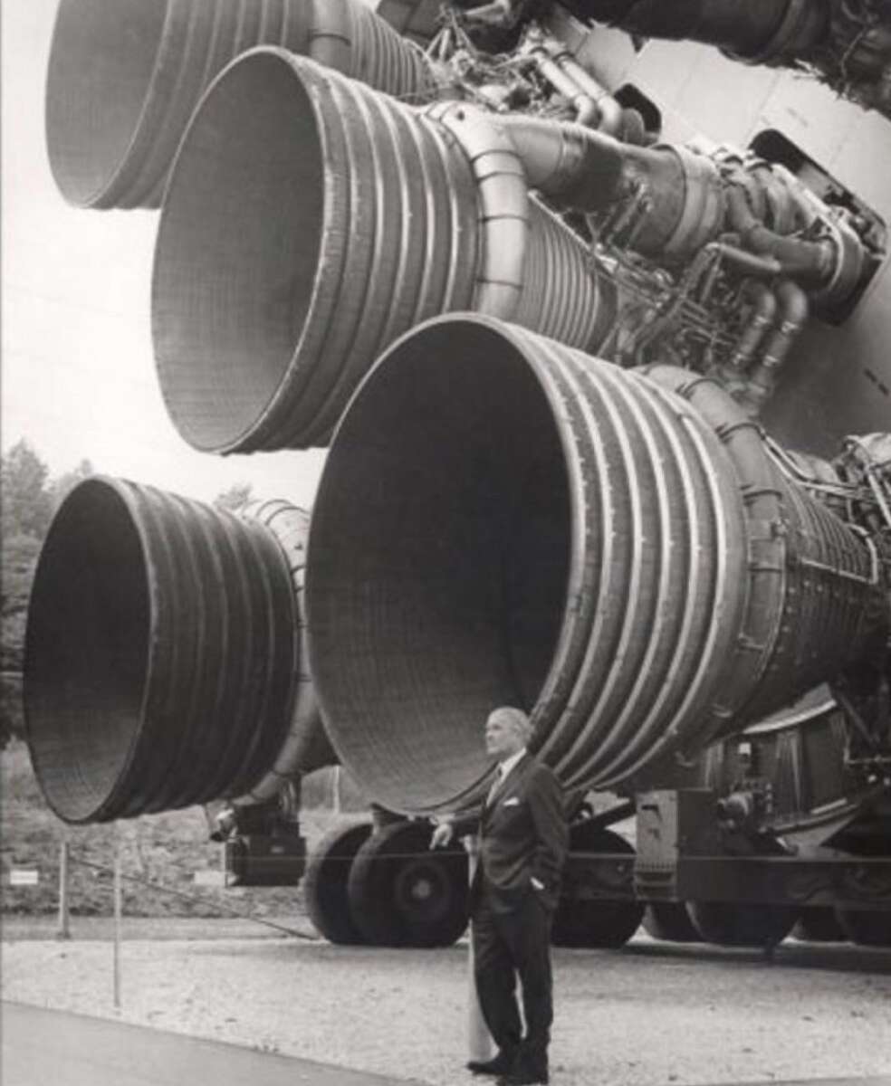12. Wernher von Braun, chief architect of the Saturn V Rocket, standing next to his invention, 1960s