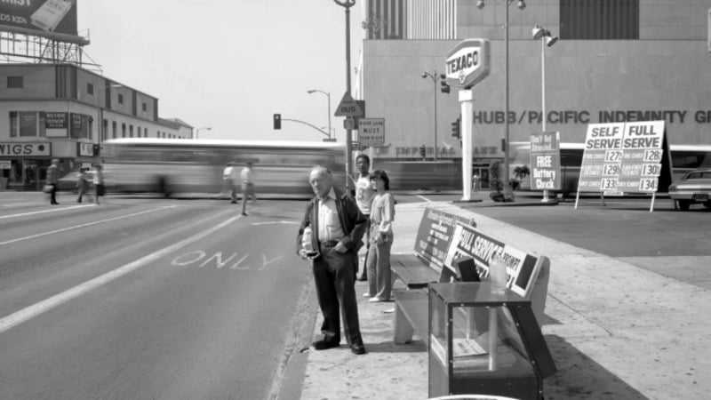 Before Uber and apps, this was the daily grind, waiting for the next bus in bell-bottoms, clutching your tote or newspaper.
