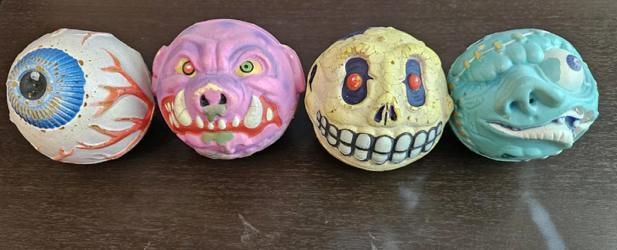 Gross-out rubber balls with gory designs, but not exactly safe. Some had hard surfaces and odd protrusions that hurt when thrown. Their eyes, tongues, or spikes made them more painful than playful.