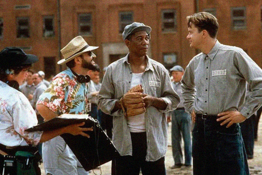 Morgan Freeman and Tim Robbins share a moment with director Frank Darabont in this relaxed behind-the-scenes shot. The intense emotional weight of The Shawshank Redemption makes this glimpse of camaraderie all the more touching. It’s clear the film’s heart began off-screen.