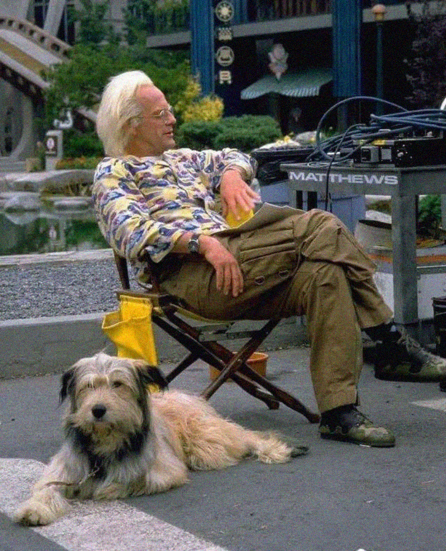 Christopher Lloyd, still in costume as Doc Brown, takes a breather next to his canine co-star. This quiet pause between filming shows how even time travelers need a moment to reset. It’s a comforting reminder that magic is made one scene at a time.