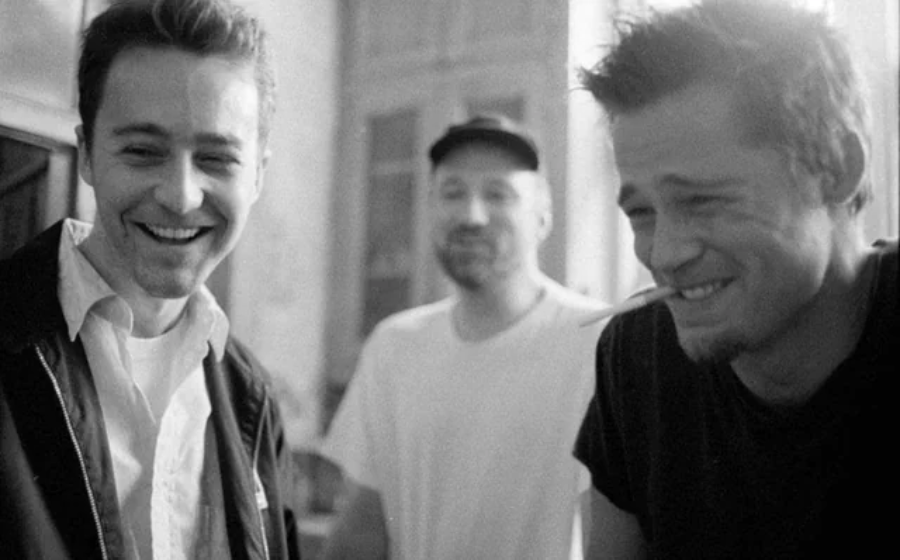 5. Brad Pitt, Edward Norton, and David Fincher share a laugh together while on the set of Fight Club, 1999