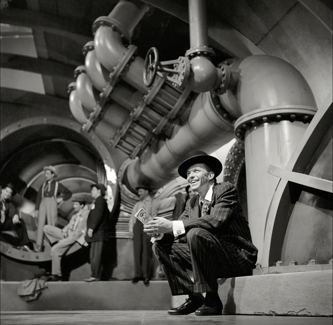 Dressed to the nines, Frank Sinatra shares a grin during a break in Guys and Dolls. His off-screen charisma was just as magnetic as on stage. It’s a reminder that stars of the Golden Age knew how to light up every frame on or off camera.