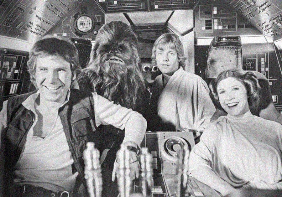 Harrison Ford, Carrie Fisher, Mark Hamill, and Chewbacca are beaming during downtime on the Star Wars set. It’s a nostalgic shot of young stars who didn’t yet know they were creating an empire. The Force was clearly strong with this group even off-camera.