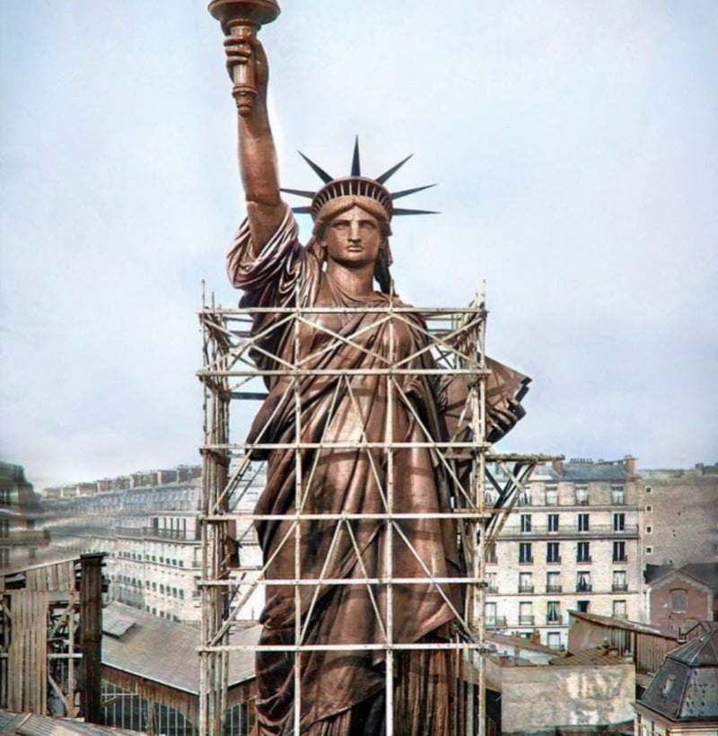 Before she ever graced New York, Lady Liberty was assembled in Paris piece by piece. This vintage photo shows the statue mid-construction, towering over the French workmen below.