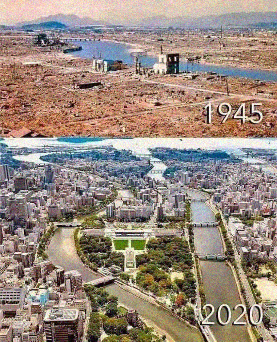 13. The transformation of Hiroshima shown through photographs from 1945 and 2020 taken from the same vantage point