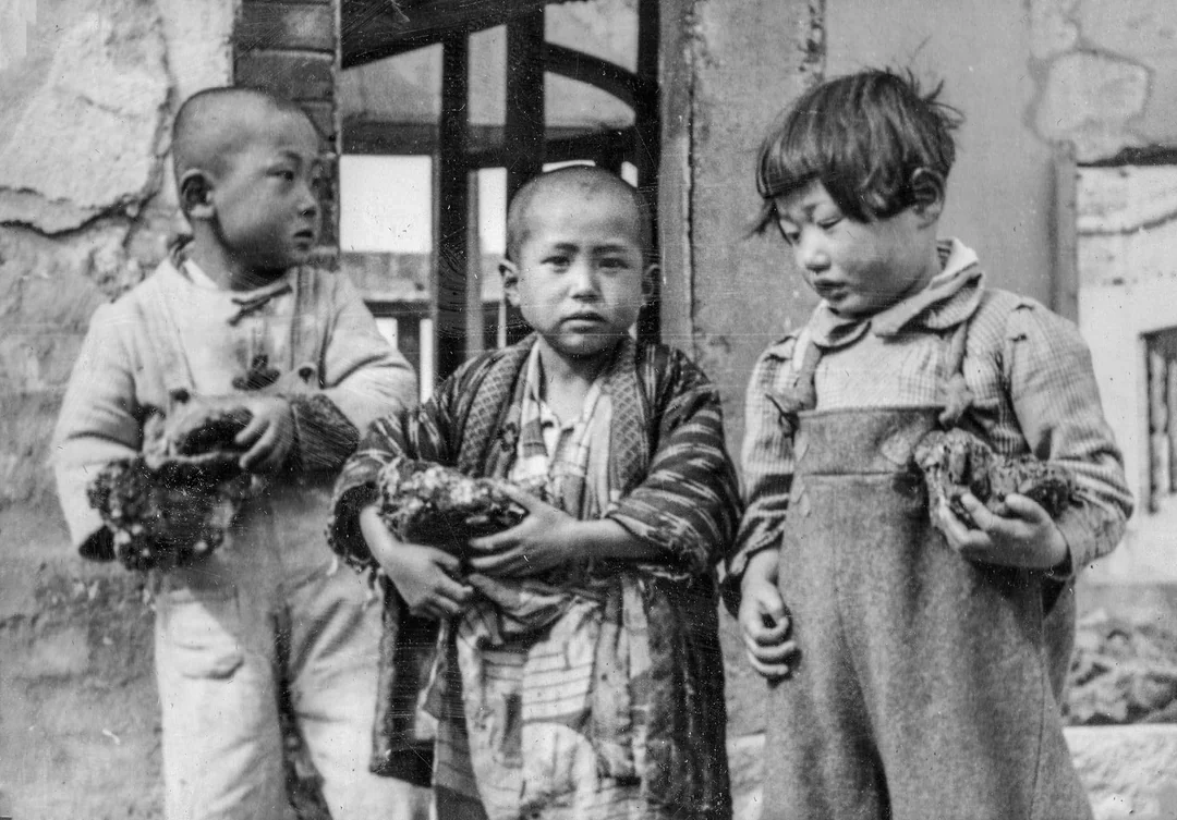 9. Japanese children hold rocks scorched by the Hiroshima blast as they stand before the ruins of a building in March 1948