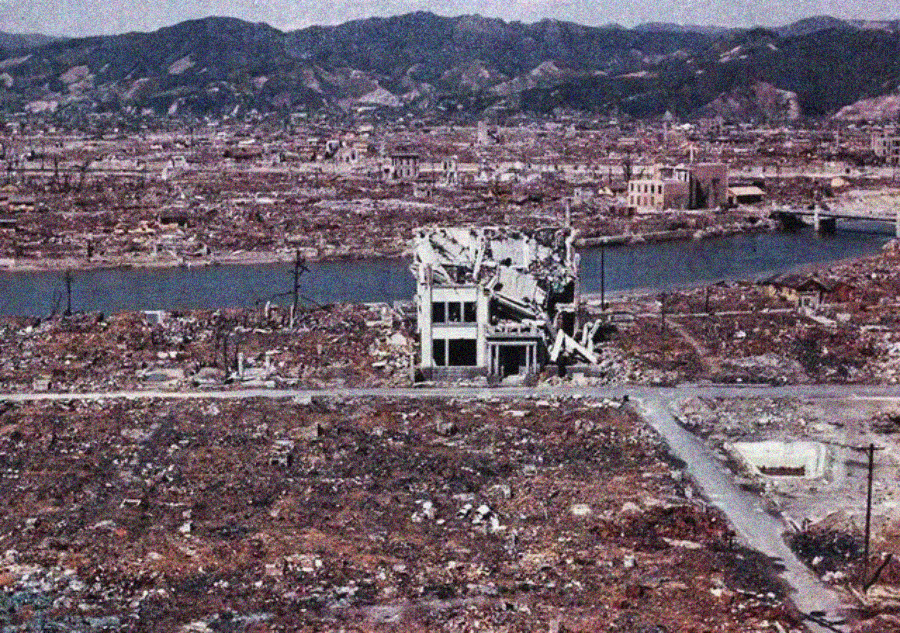 7. A lone man stands in silent reflection in the middle of the ruins of a destroyed Hiroshima