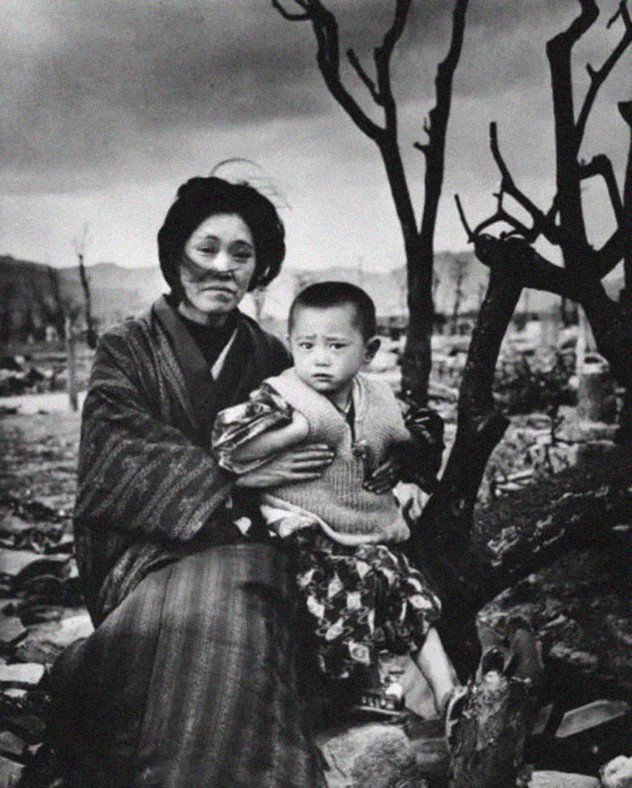 2. A Japanese mother and child sit among rubble and scorched trees in Hiroshima, just four months after the atomic bomb struck in December 1945