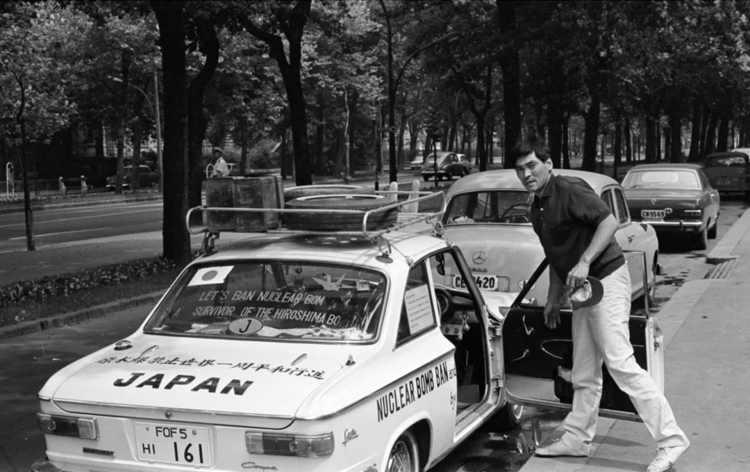 6. Masashi Nii, Hiroshima survivor, stands beside his sticker-covered car in 1967 after dedicating his life to banning nuclear weapons