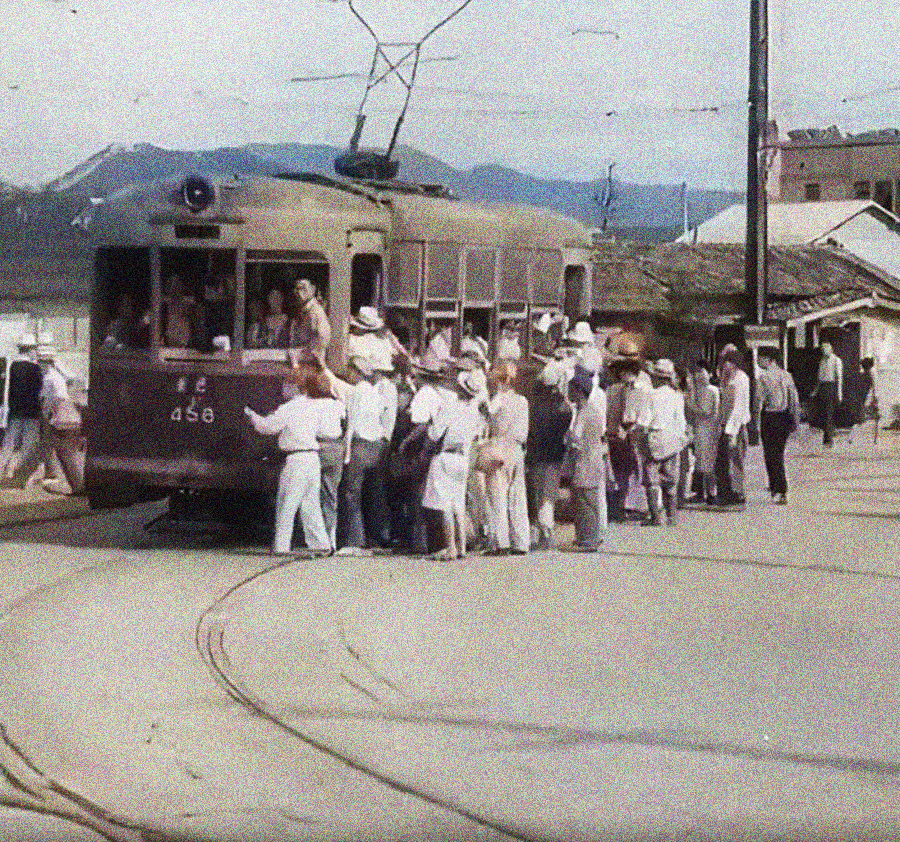 4. Daily life returns as a crowd boards the tram in Hiroshima in 1946, a fragile step toward normalcy after the destruction
