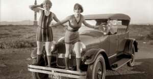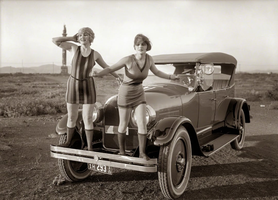 5. Two flappers, testing the structural integrity of the bumper on this car, San Francisco, 1923