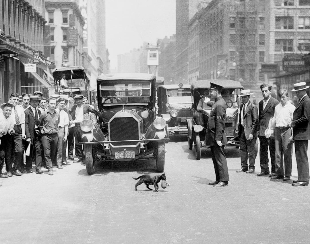 11. A policeman holds traffic to let an adorable cat carry her kittens across the street, 1923