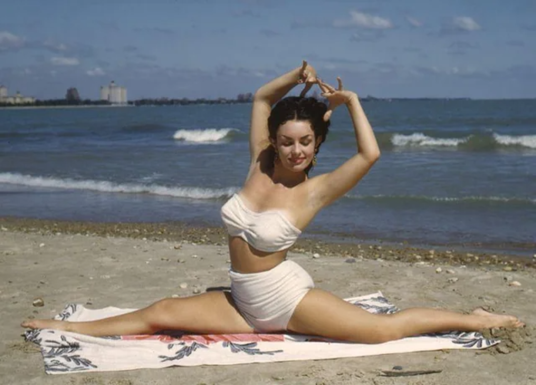 17. A Kodachrome shot of a woman doing yoga at the beach, 1940s