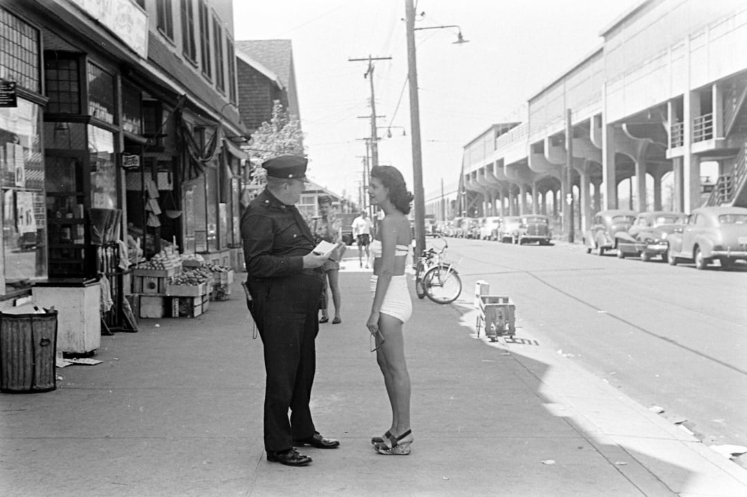 25. Getting a ticket for indecent exposure at Rockaway Beach, New York, 1946