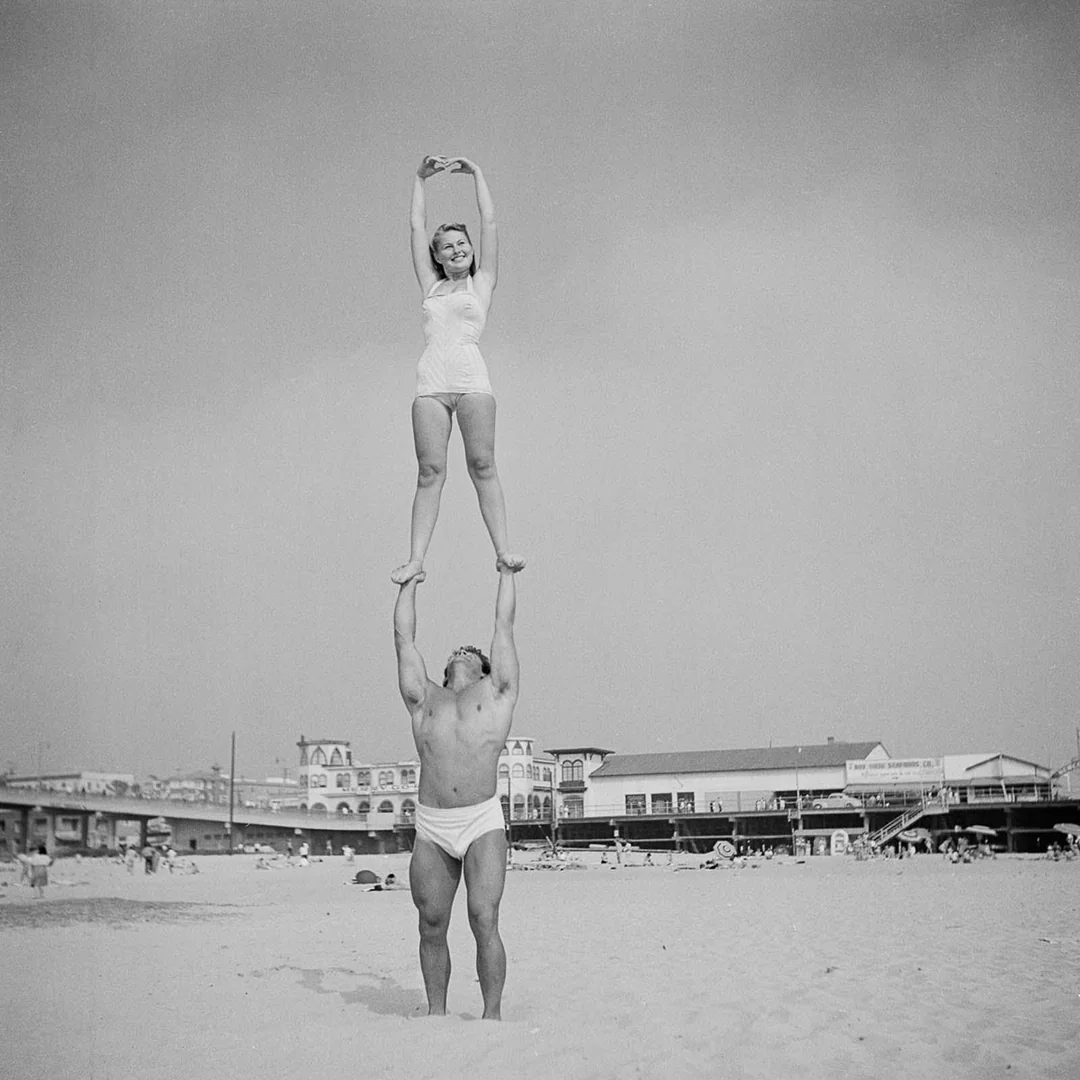 6. Some people like to go to the beach to relax, others go to do stuff like this, Muscle Beach, California, 1940s