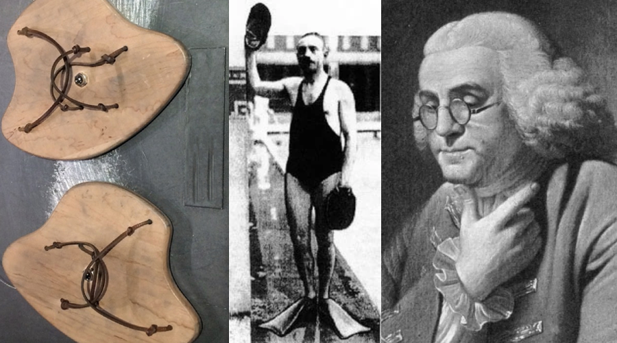 An avid swimmer since childhood, Franklin grew frustrated by the clumsy wooden floats of his day and sketched a pair of hand-worn fins, early prototypes of modern swim aids. He tested them across the Thames on one of his return trips to England, reporting that they “made swift water feel like wind beneath wings.” This little gadget highlights Franklin’s restless inventiveness: solving everyday problems with inspired simplicity.