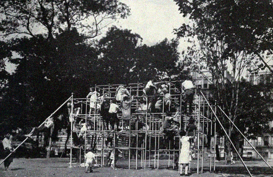 These “gymnasiums” were metal tubes that assembled into ladders and rings over hard earth. The fun part was climbing; the unfun part was gravity. Grass wasn’t padding, it was décor.
