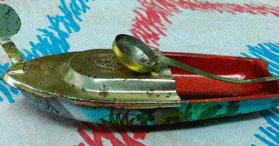 A candle heated a tiny boiler that puffed water through twin tubes, sending the toy chugging along. The hull got hot and the flame wandered in even the gentlest breeze. Parents supervised by saying “be careful” from a lawn chair.