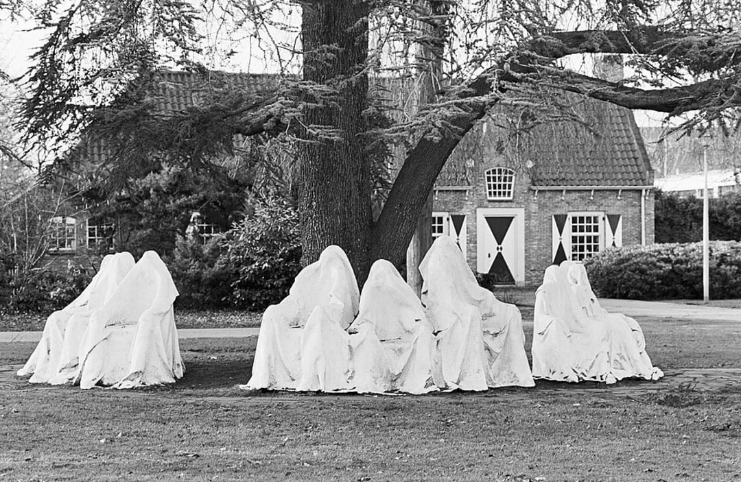Known as “The Anonymous,” this installation features nine hooded figures arranged in a circle around a tree, each draped in weathered, ghost-like robes. Created by artist Paul Elshout, the group is meant to represent collective silence and anonymous suffering.