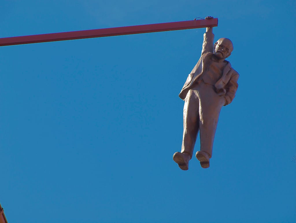This surreal sculpture by David Černý dangles Sigmund Freud by one hand from a high pole, with no warning signs around to explain the scene. Discovering this life‑like figure suspended overhead catches unsuspecting pedestrians off guard. Some people have even thought they were witnessing a real person in danger.