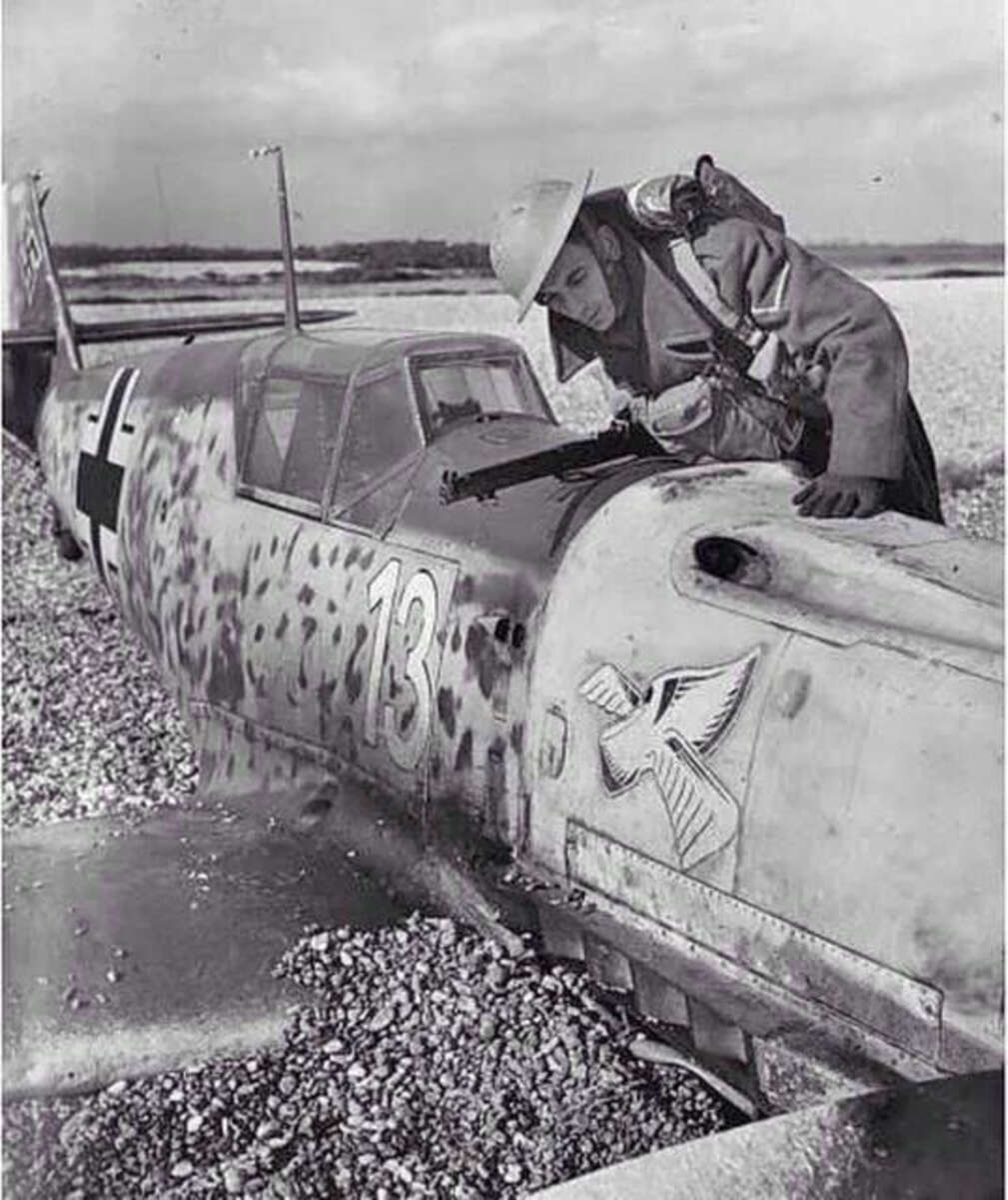 16. A member of Britain’s Home Guard inspects a beached Bf-109 during the Battle of Britain