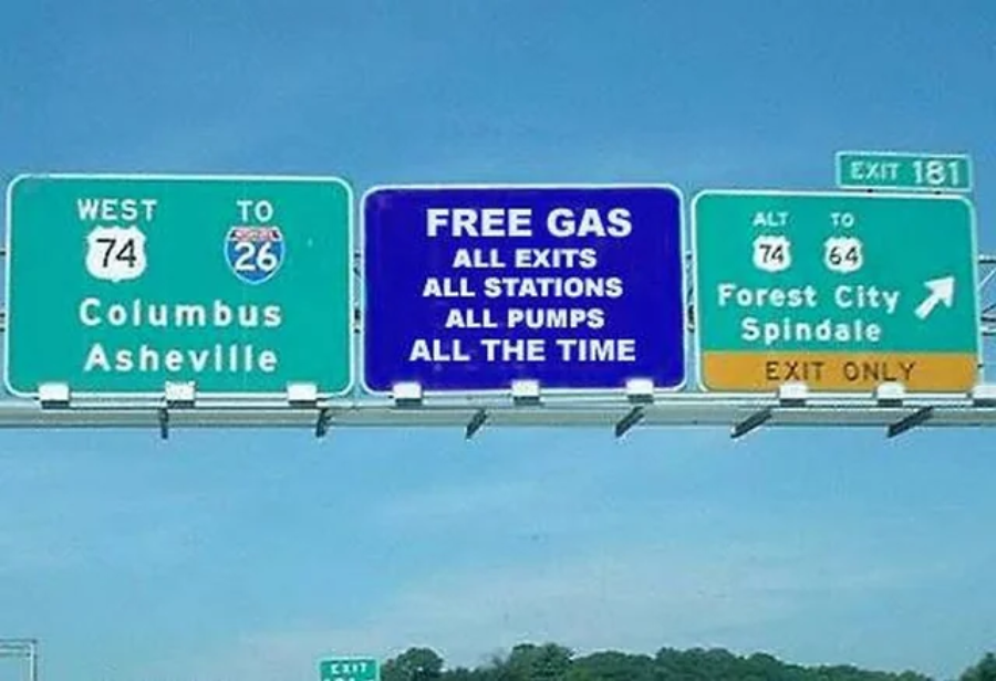 10. “Free gas: all exits, all stations, all pumps, all the time”