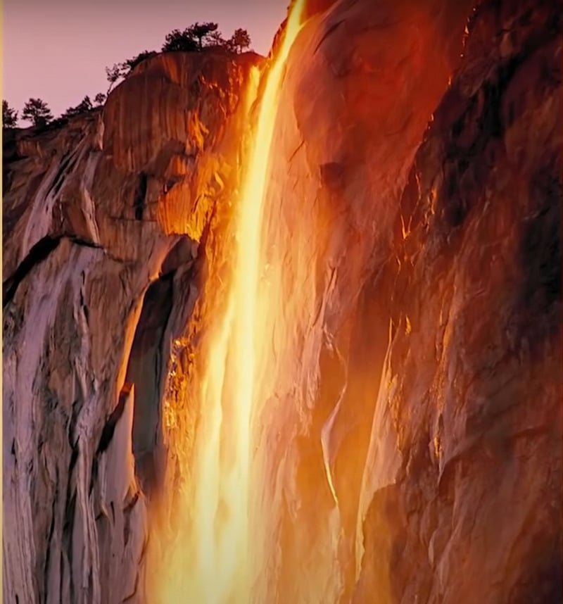 When sunlight hits a waterfall at just the right angle, it glows like molten lava. known as the “firefall”, it´s a rare but breathtaking natural illusion.