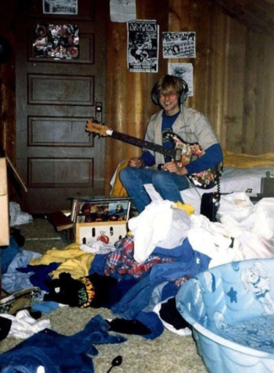 8. 18-year-old Kurt Cobain practicing guitar in his bedroom in Aberdeen, Washington, 1985