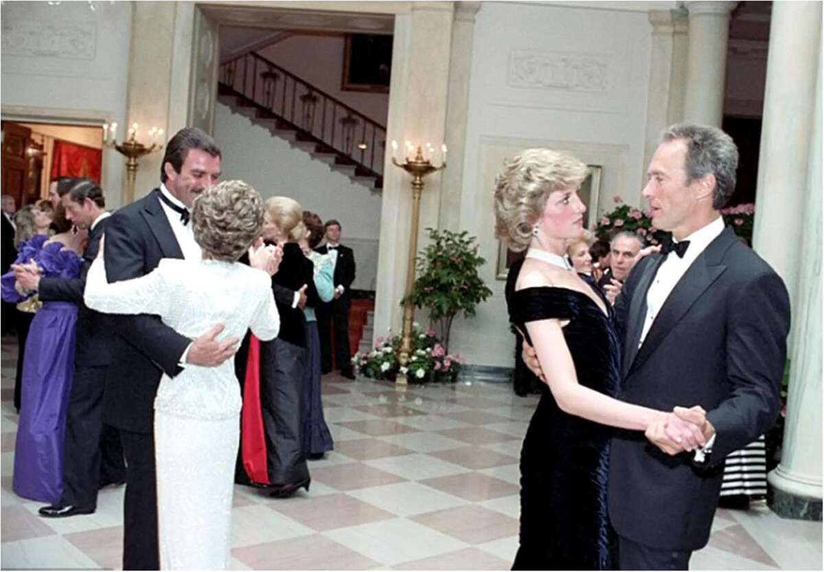 2. Tom Selleck, Nancy Reagan, Clint Eastwood, and Princess Diana dancing at the White House in 1985