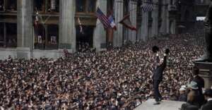 19. Charlie Chaplin selling war bonds on Wall Street, 1918