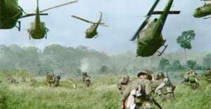 9. Helicopters fire into the tree line to cover advancing troops, near the Cambodian border, 1965
