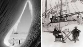 1. Members of Robert F. Scott’s expedition to the South Pole inside an ice grotto, looking at the Terra Nova ship in the distance, 1911