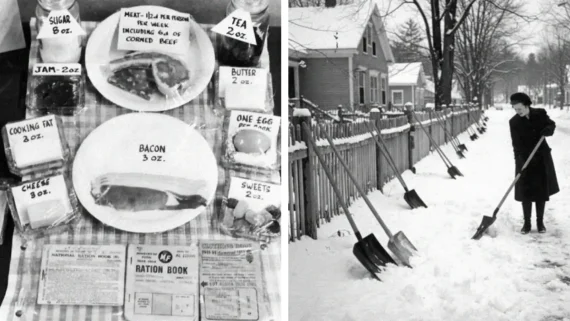 People lined up in coats and boots with ration books tucked inside their mittens. Coupons decided butter, sugar, meat, and canned goods; even the holiday’s baking depended on them. Shoppers learned to swap recipes and make do when shelves were thin.